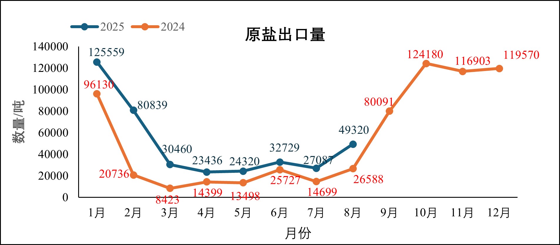 根据海关统计数据,2025年8月我国进口原盐83.89万吨,同比减少21.41%;1-8月我国累计进口原盐总量924.92万吨,同比增长11.93%。