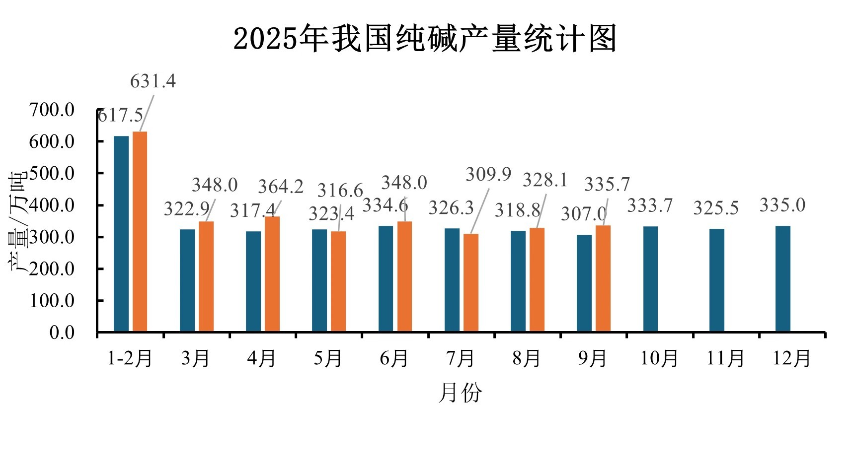 根据国家统计局数据,2025年9月我国纯碱产量335.7万吨,同比增加9.35%。