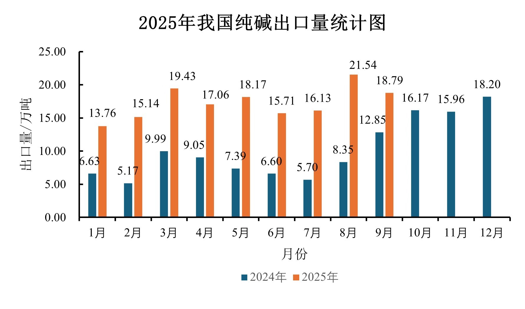 1. 根据海关统计数据,2025年9月我国出口纯碱18.79吨,同比增长46.23%;1-9月我国出口纯碱总量155.73万吨,同比增长117.11%。