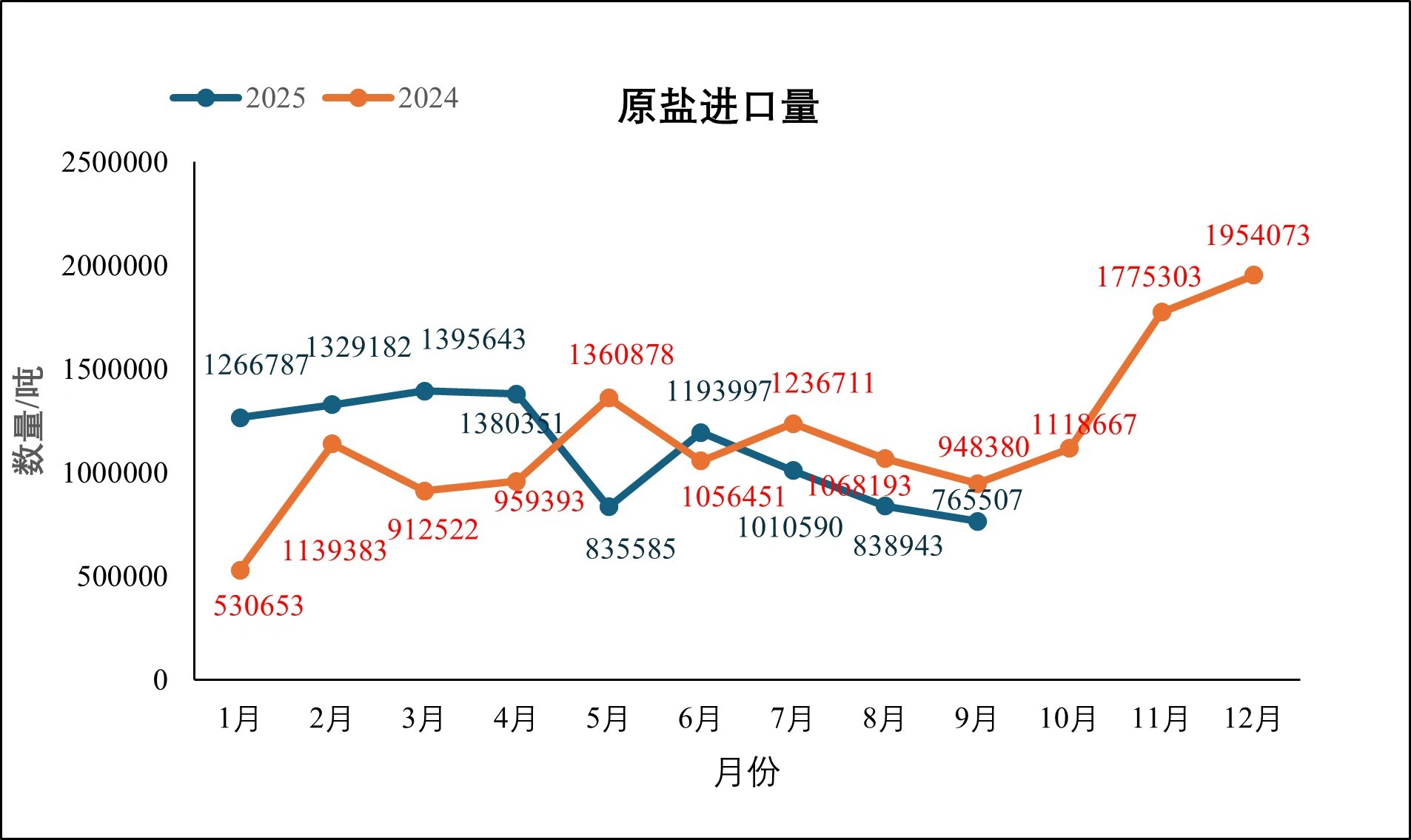 根据海关统计数据,2025年9月我国进口原盐76.55万吨,同比减少19.29%;1-9月我国累计进口原盐总量1001.48万吨,同比增长8.72%。
