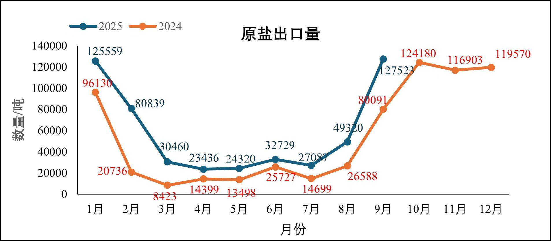 根据海关统计数据,2025年9月我国出口原盐12.75万吨,同比增加58.98%;1-9月我国累计出口原盐总量52.13万吨,同比减少73.54%。