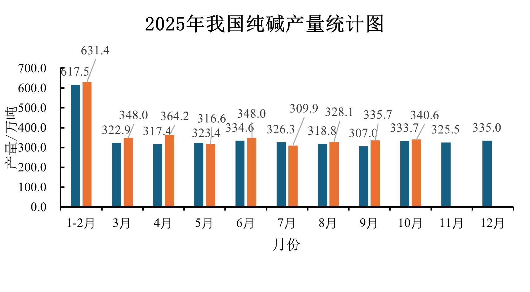 根据国家统计局数据,2025年10月我国纯碱产量340.6万吨,同比增加2.07%。