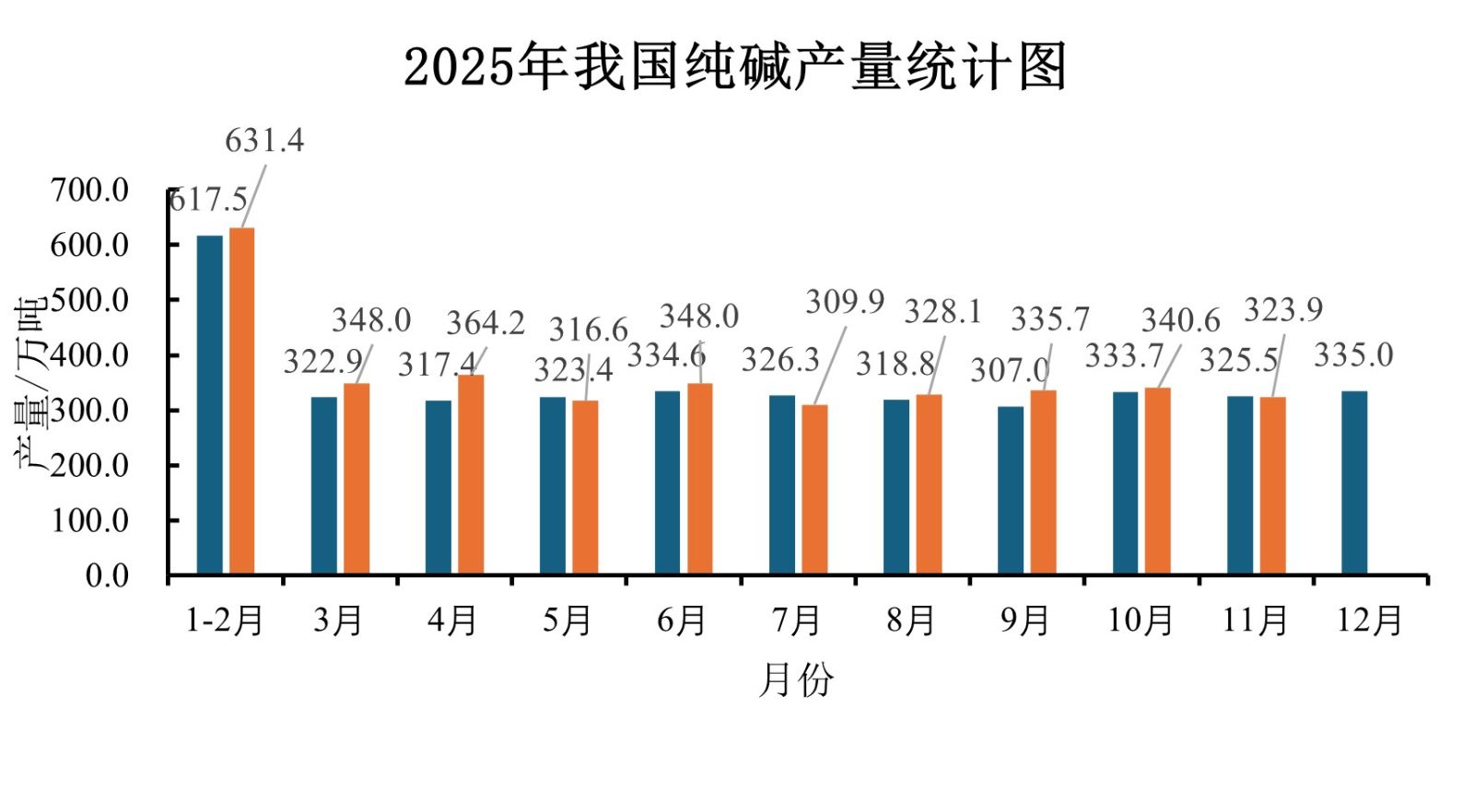 根据国家统计局数据,2025年11月我国纯碱产量323.9万吨,同比减少0.49%。