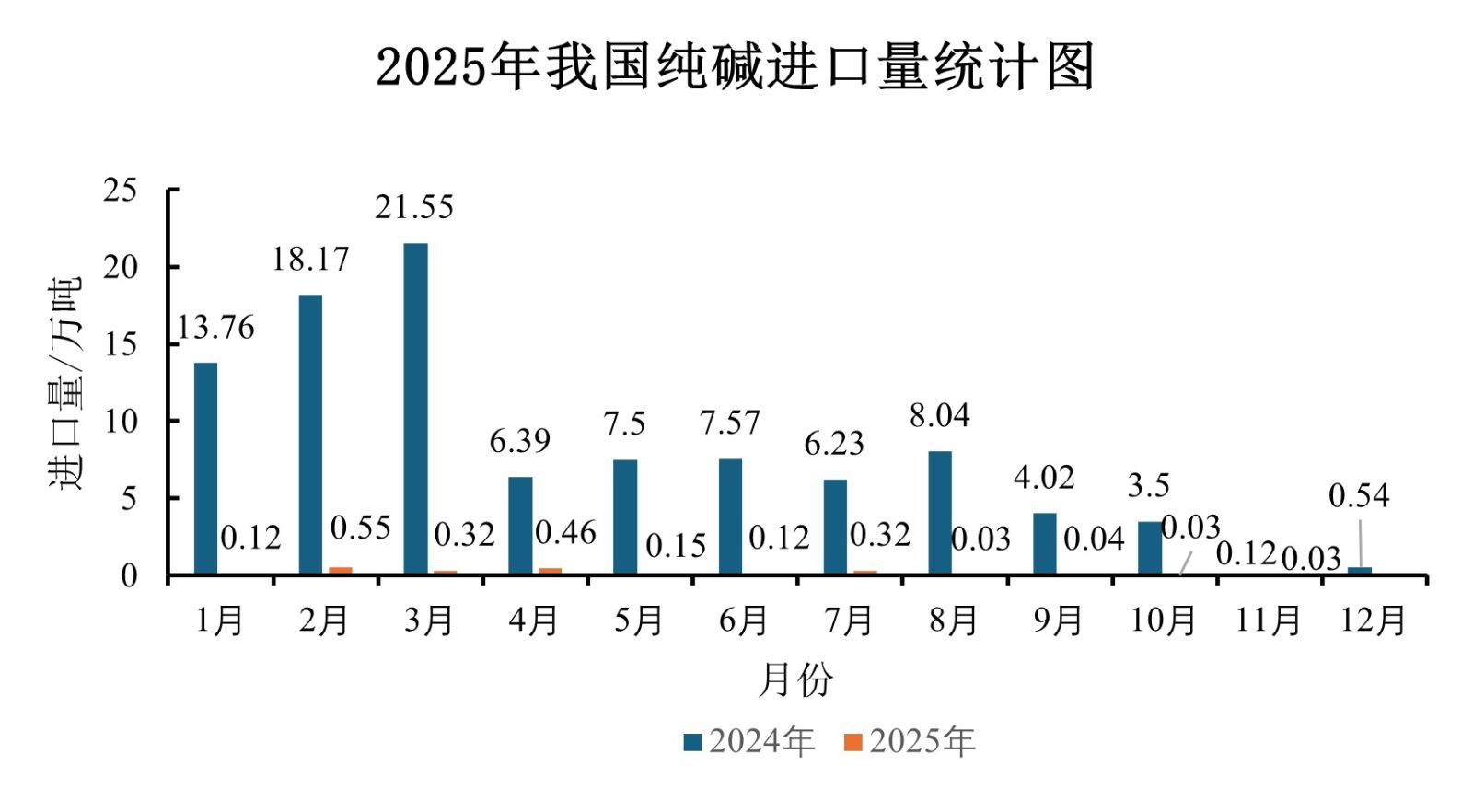 1根据海关统计数据,2025年11月我国进口纯碱0.03万吨,同比减少75%;1-11月我国进口纯碱总量2.17万吨,同比减少97.76%。