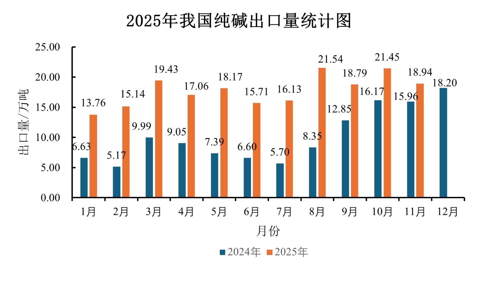 1根据海关统计数据,2025年11月我国出口纯碱18.94吨,同比增长18.67%;1-11月我国出口纯碱总量196.12万吨,同比增长88.83%。