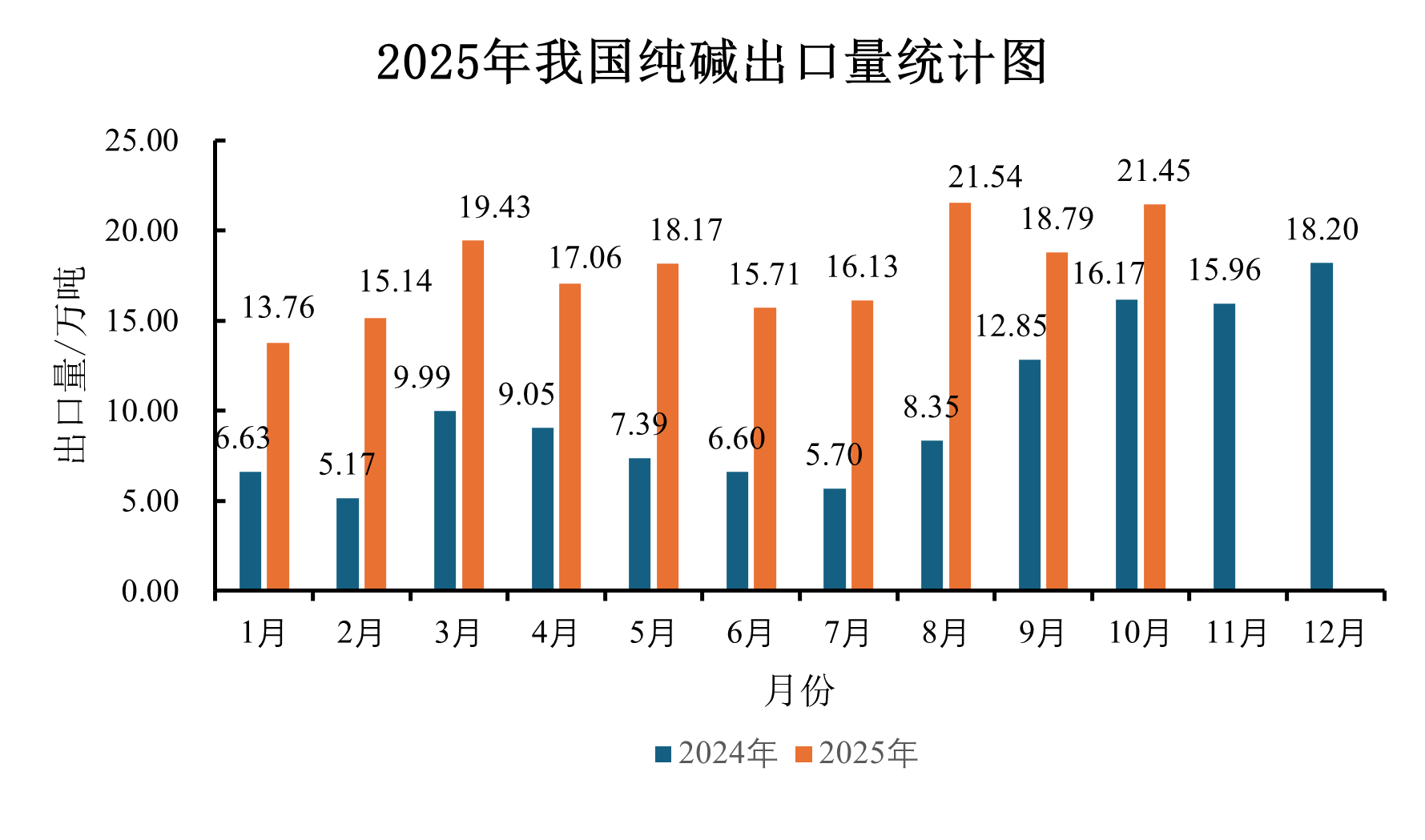 1. 根据海关统计数据,2025年10月我国出口纯碱21.45吨,同比增长32.65%;1-10月我国出口纯碱总量177.18万吨,同比增长101.57%。