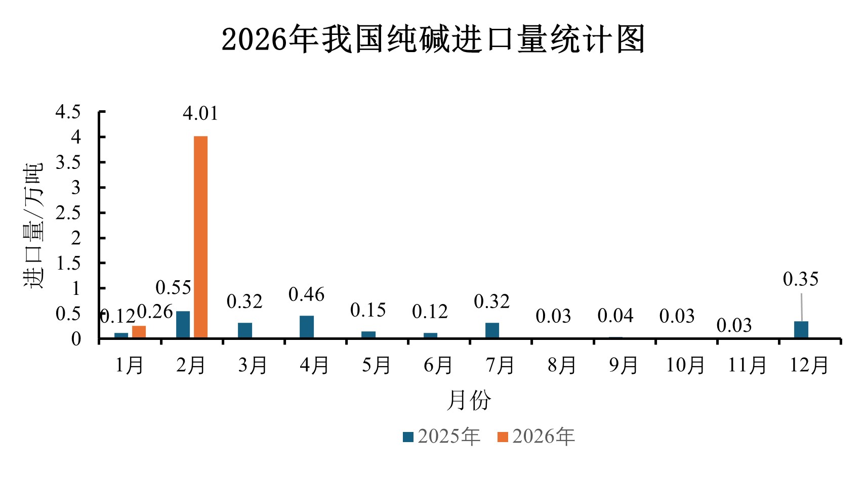 1. 根据海关统计数据,2026年1月我国进口纯碱0.26万吨,同比增长116.67%;2026年2月我国进口纯碱4.01万吨,同比增长629.09%;1-2月我国进口纯碱总量4.27万吨,同比增长537.31%。