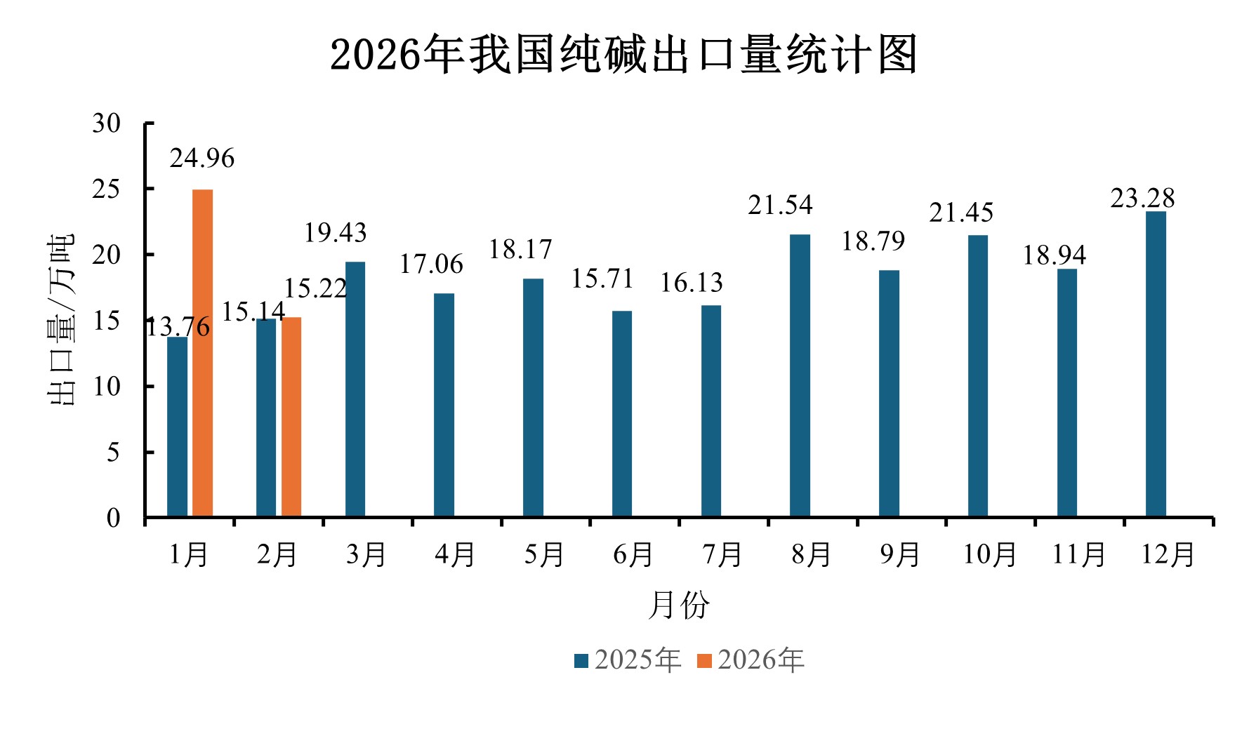 1. 根据海关统计数据,2026年1月我国出口纯碱24.96吨,同比增长81.40%;2026年2月我国出口纯碱15.22吨,同比增长0.53%;1-2月我国出口纯碱总量40.18万吨,同比增长39.03%。